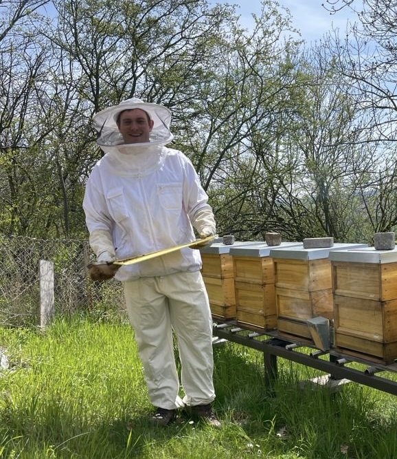 Als er sich 2017 intensiver mit der ökologischen Bewirtschaftung auseinandersetzte, führte ihn sein Weg fast zwangsläufig zur Imkerei – einer Welt voller Summen, Blüten und goldener Schätze. Die ersten praktischen Erfahrungen sammelte er bei einem befreundeten Imker, bevor er 2019 einen Anfängerkurs am Deutschen Bienenmuseum in Weimar absolvierte, der ihn befähigte, seinen Honig mit anderen zu teilen.
