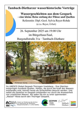 Dipl.-Geoln Sylvia Reyer-Rohde vom e.t.a. Sachverständigenbüro Reyer in Erfurt (Geopark-Managementbüro) wird mit Ihnen am 26. September 2025 um 19:00 Uhr im Bürgersaal/Rathaus in Tambach-Dietharz, Burgstallstraße 31a unter dem Titel "Wassergeschichten aus dem Geopark" eine kleine Reise entlang der (Fließ-)Gewässer unternehmen. Im UNESCO Global Geopark Thüringen Inselsberg - Drei Gleichen entspringen hunderte Quellen. Höhlen, die durch die Kraft des Wassers entstanden sind, können heute als Schauhöhlen besucht werden. Und selbst die Gesteine im Geopark entstanden nur durch die Anwesenheit von urzeitlichen Meeren. Wir laden Sie ein zu einer spannenden „Wasser“-Reise durch den Thüringer Geopark.