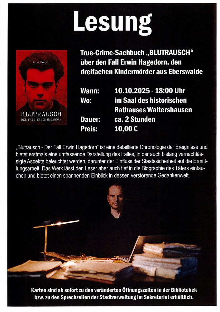 Am 10.10.2025 18:00 Uhr stellt der Autor Marko Kreutz sein True-Crime-Sachbuch "BLUTRAUSCH" über den Fall Erwin Hagedorn im Saal des historischen Rathauses Waltershausen vor. Freuen Sie sich auf eine zweistündige mitreißende Vorlesung.