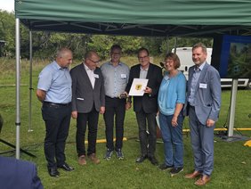 Nach einer Begrüßung durch Marco Schütz (Bürgermeister der Stadt Tambach-Dietharz) und Florian Hofmann (Bürgermeister der Landgemeinde Georgenthal) folgten weitere einleitende Grußworte von Dr. Tobias Pfeifer-Helke (Stiftungsdirektor der Friedenstein Stiftung Gotha), Tilo Kummer (Minister für Umwelt, Naturschutz, Energie und Forsten), Kay Brückmann (Bürgermeister der Stadt Friedrichroda) und Onno Eckert (Landrat des Landkreises Gotha). Feierlich wurde im Anschluss Minister Kummer ein kleines Präsent überreicht. Das Thüringer Umweltministerium, vertreten durch den Minister für Umwelt, Naturschutz, Energie und Forsten Tilo Kummer, hat nicht nur die finanzielle Unterstützung für die Grabungen an der Fossillagerstätte Bromacker für die Jahre 2025 –2026 bestätigt, sondern auch sein politisches Engagement für eine langfristige Finanzierung bekräftigt.