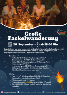 Am 26. September ab 18:00 Uhr lädt die Tourist-Information Trusetal zu einer spannenden Fackelwanderung mit Wanderführer Thomas Käbel ein. Start- und Zielpunkt ist das Besucherbergwerk „Hühn“. Die Tour führt über den Wallenburger Turm und endet gegen 20:00 Uhr am Lagerfeuer mit gemütlicher Atmosphäre. Dort erwartet die Teilnehmer ein kühles Getränk nach Wahl, Stockbrot, Würstchen und Marshmallows.